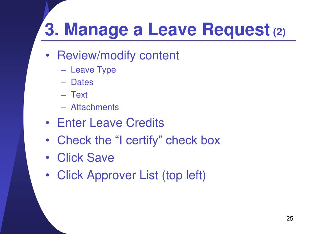 3. Manage a Leave Request (2) • Review/modify content • Leave Type • Dates • Text • Attachments • Enter Leave Credits • Check the “I certify” check box • Click Save • Click Approver List (top left)