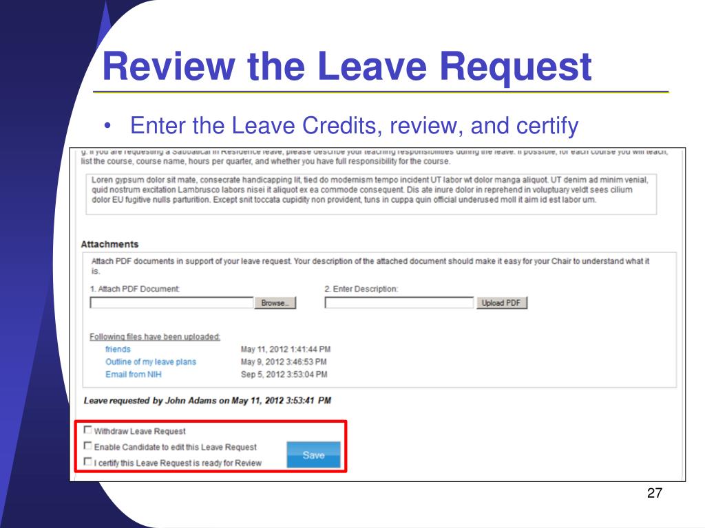Review the Leave Request • Enter the Leave Credits, review, and certify