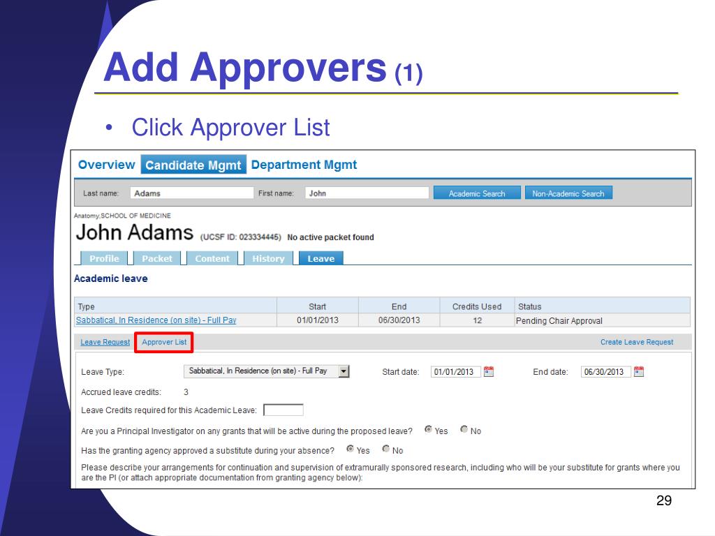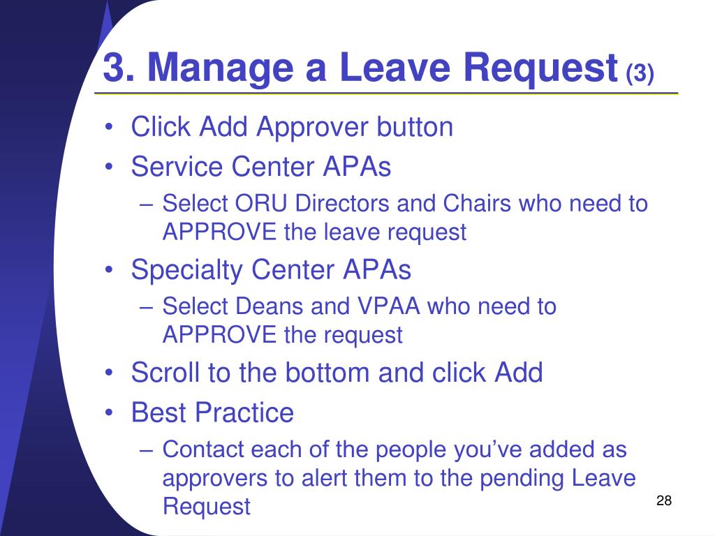 3. Manage a Leave Request (3) • Click Add Approver button • Service Center APAs • Select ORU Directors and Chairs who need to APPROVE the leave request • Specialty Center APAs • Select Deans and VPAA who need to APPROVE the request • Scroll to the bottom and click Add • Best Practice • Contact each of the people you’ve added as approvers to alert them to the pending Leave Request
