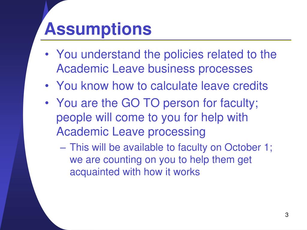 Academic Leave. Academic Leave September 2012. Academic Leave Training. Assumptions Training Goals Academic Leave Procedures Things to Consider. Assumptions. You understand the policies related to the Academic Leave business processes You know how to calculate leave credits