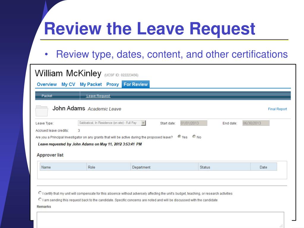 4. Approve a Leave Request (2) • Review content • Leave Type and Dates • Text and Attachments • Select a certification at the bottom • “I am sending this request back…” will reset prior certifications, requiring re-certification by all approvers • Add some remarks • Click Certify