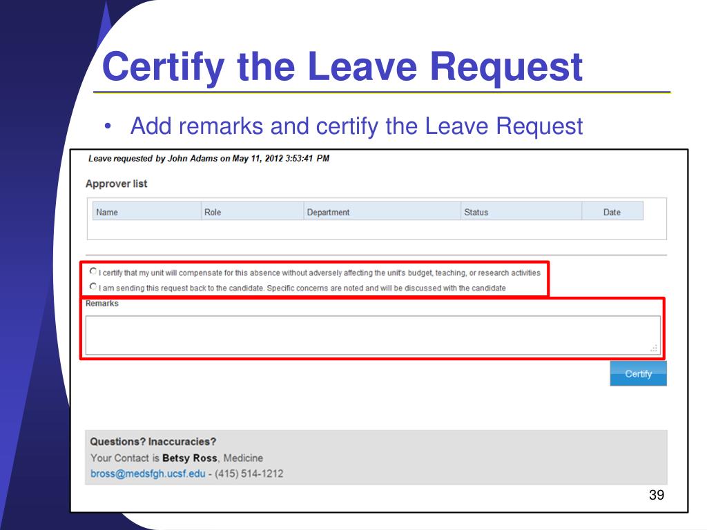 Certify the Leave Request • Add remarks and certify the Leave Request