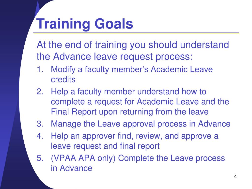 Training Goals At the end of training you should understand the Advance leave request process: • Modify a faculty member’s Academic Leave credits • Help a faculty member understand how to complete a request for Academic Leave and the Final Report upon returning from the leave • Manage the Leave approval process in Advance • Help an approver find, review, and approve a leave request and final report • (VPAA APA only) Complete the Leave process in Advance