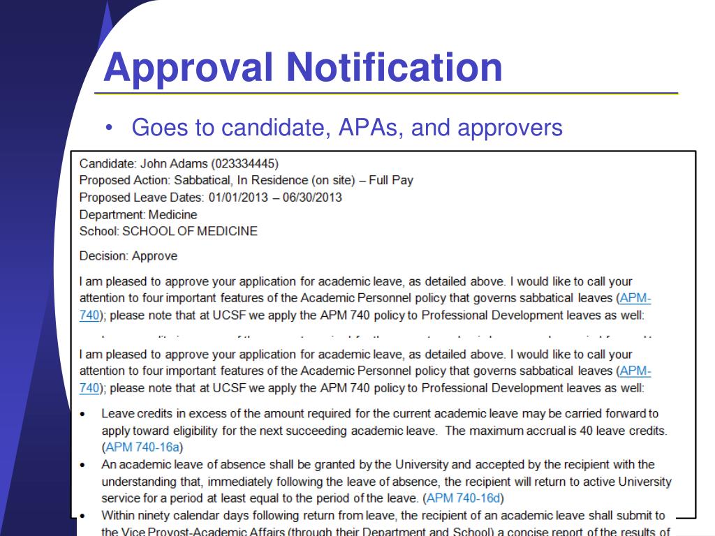 5. Notifications • Advance sends three notifications when a Leave Request is approved by VPAA: • Approval notification to candidate, APA, and approvers is sent when VPAA approves • Payroll Record update reminder is sent to the APA one month prior to the start of the leave • Final Report reminder is sent to the candidate on the last day of the leave