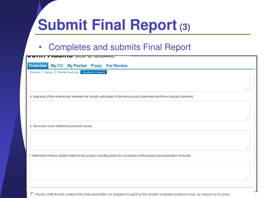 Submit Final Report (2) • Verifies that the leave taken matches the request