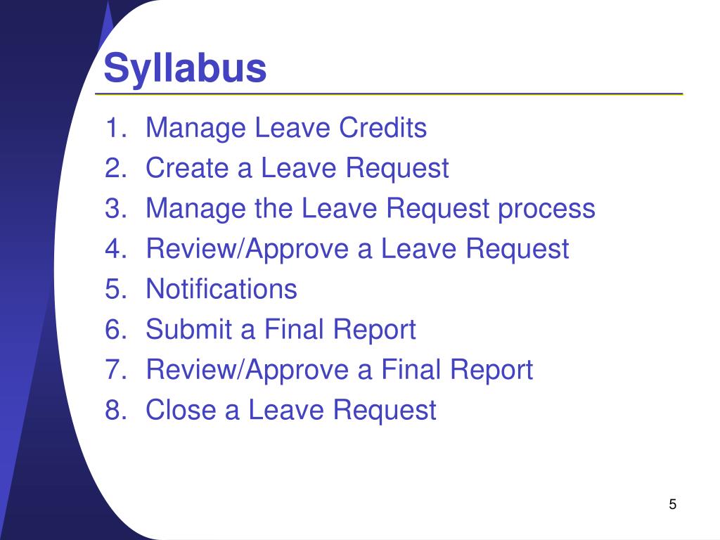 Syllabus • Manage Leave Credits • Create a Leave Request • Manage the Leave Request process • Review/Approve a Leave Request • Notifications • Submit a Final Report • Review/Approve a Final Report • Close a Leave Request
