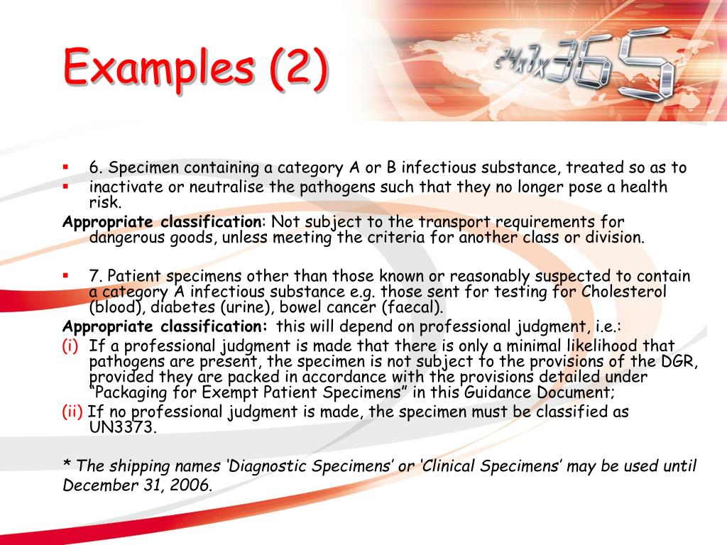 Examples (2) • 6. Specimen containing a category A or B infectious substance, treated so as to • inactivate or neutralise the pathogens such that they no longer pose a health risk. Appropriate classification: Not subject to the transport requirements for dangerous goods, unless meeting the criteria for another class or division. • 7. Patient specimens other than those known or reasonably suspected to contain a category A infectious substance e.g. those sent for testing for Cholesterol (blood), diabetes (urine), bowel cancer (faecal). Appropriate classification: this will depend on professional judgment, i.e.: • If a professional judgment is made that there is only a minimal likelihood that pathogens are present, the specimen is not subject to the provisions of the DGR, provided they are packed in accordance with the provisions detailed under “Packaging for Exempt Patient Specimens” in this Guidance Document; (ii) If no professional judgment is made, the specimen must be classified as UN3373. * The shipping names ‘Diagnostic Specimens’ or ‘Clinical Specimens’ may be used until December 31, 2006.