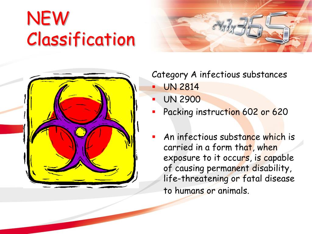 NEW Classification Category A infectious substances • UN 2814 • UN 2900 • Packing instruction 602 or 620 • An infectious substance which is carried in a form that, when exposure to it occurs, is capable of causing permanent disability, life-threatening or fatal disease to humans or animals.
