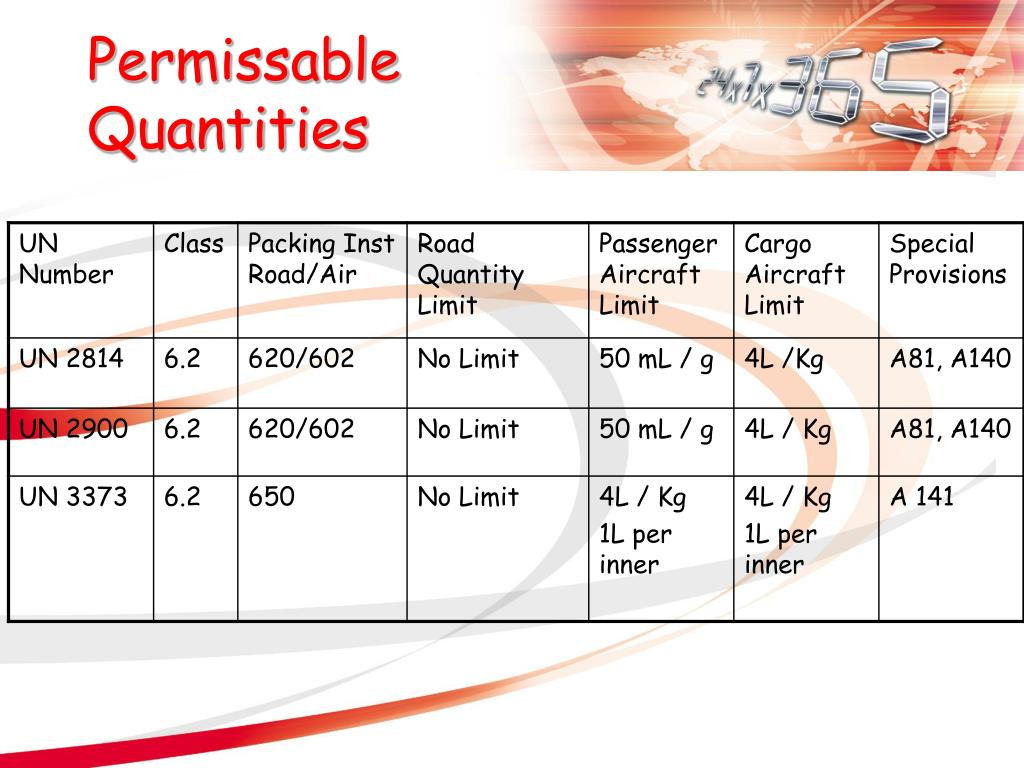 Exemptions • Material that does not contain pathogens “650 light” ≈ ‘Category C’ routine test samples. • Substances unlikely to cause disease • Blood/blood components prepared for transfusion of blood products • Tissue or organs intended for transplant • Foodstuffs, water, soil, and dust samples • Biological Material which has been processed to remove all possible pathogens