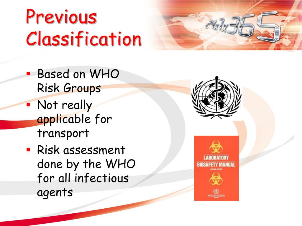 Previous Classification • Based on WHO Risk Groups • Not really applicable for transport • Risk assessment done by the WHO for all infectious agents