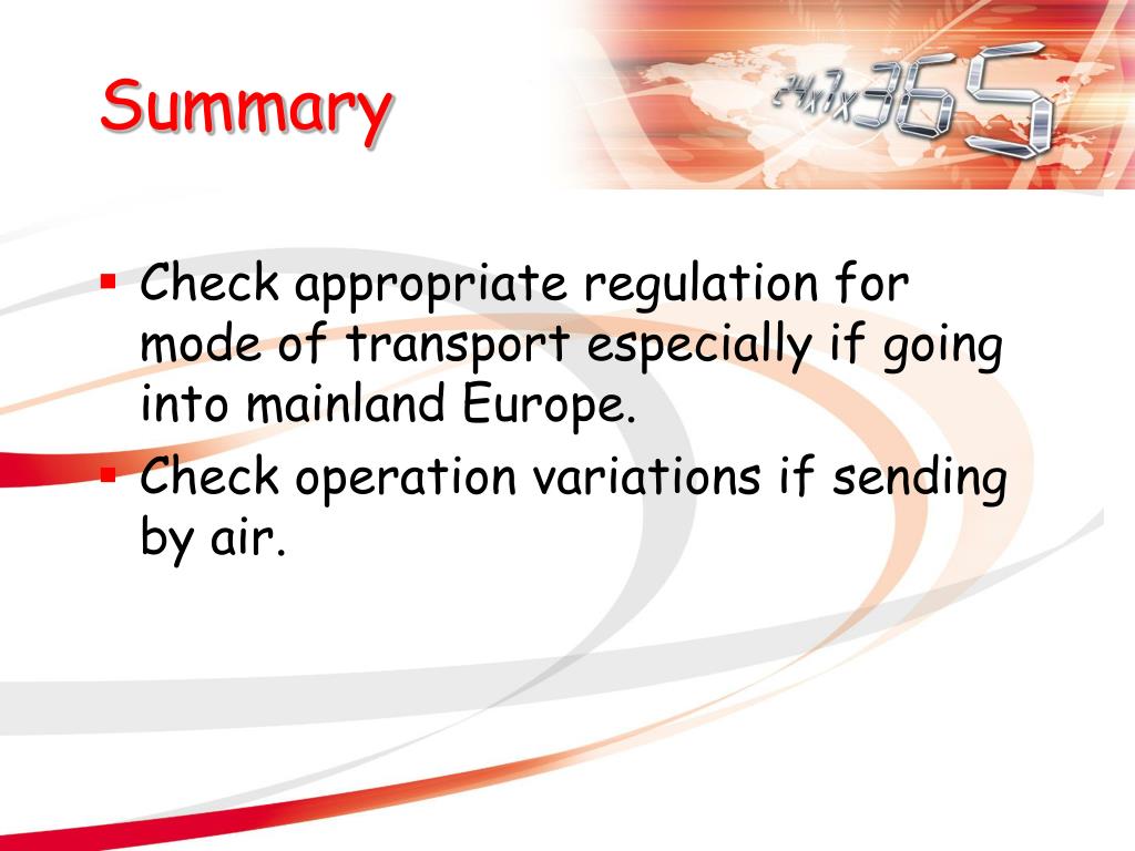 Summary • Check appropriate regulation for mode of transport especially if going into mainland Europe. • Check operation variations if sending by air.