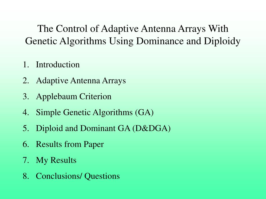 The Control of Adaptive Antenna Arrays With Genetic Algorithms Using Dominance and Diploidy • Introduction • Adaptive Antenna Arrays • Applebaum Criterion • Simple Genetic Algorithms (GA) • Diploid and Dominant GA (D&DGA) • Results from Paper • My Results • Conclusions/ Questions