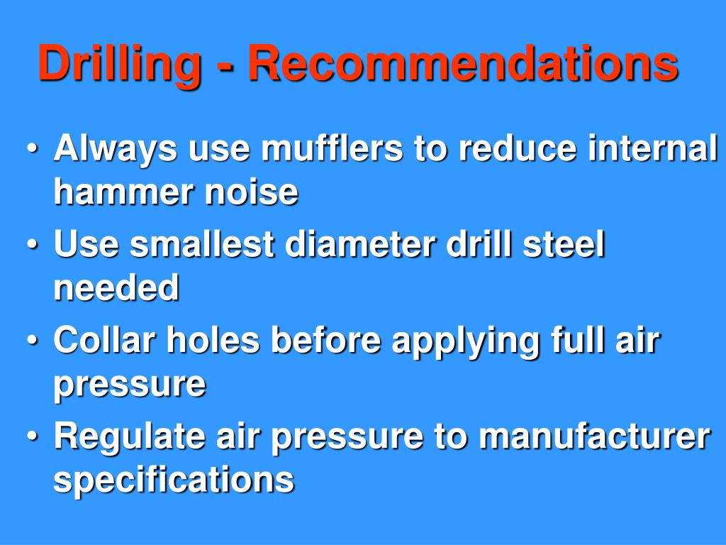Drilling - Recommendations • Always use mufflers to reduce internal hammer noise • Use smallest diameter drill steel needed • Collar holes before applying full air pressure • Regulate air pressure to manufacturer specifications