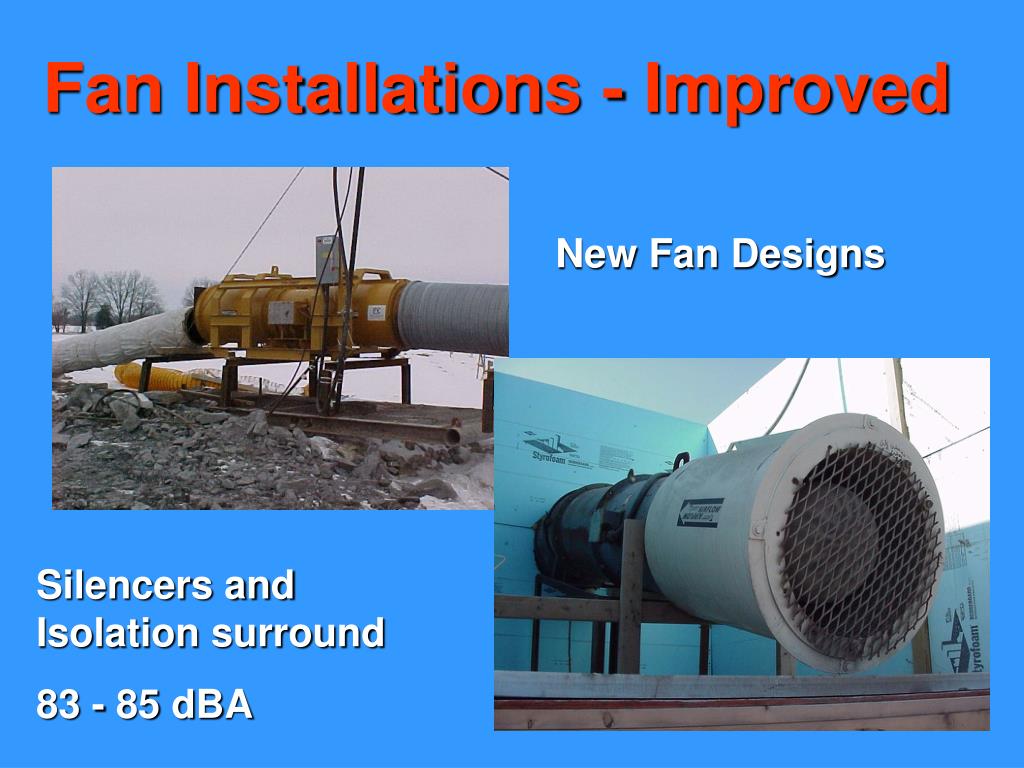 Fan Installations - Improved New Fan Designs Silencers and Isolation surround 83 - 85 dBA