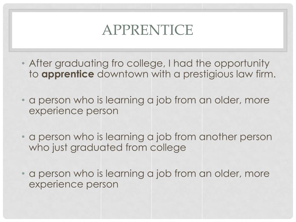 apprentice • After graduating fro college, I had the opportunity to apprentice downtown with a prestigious law firm. • a person who is learning a job from an older, more experience person • a person who is learning a job from another person who just graduated from college • a person who is learning a job from an older, more experience person