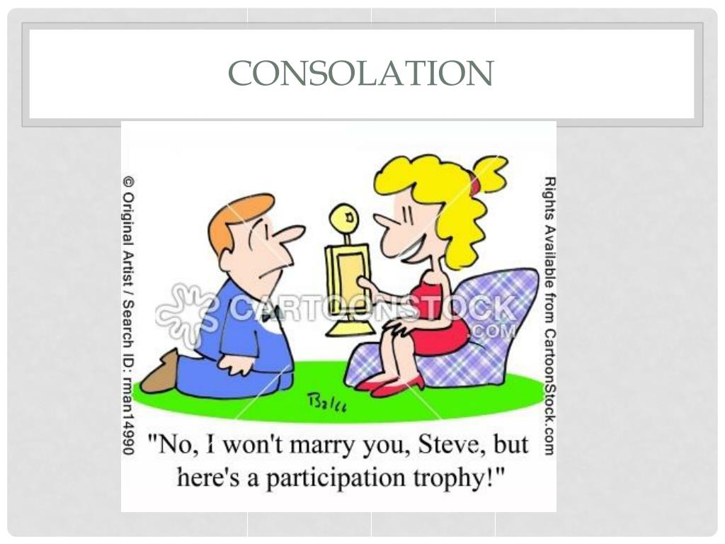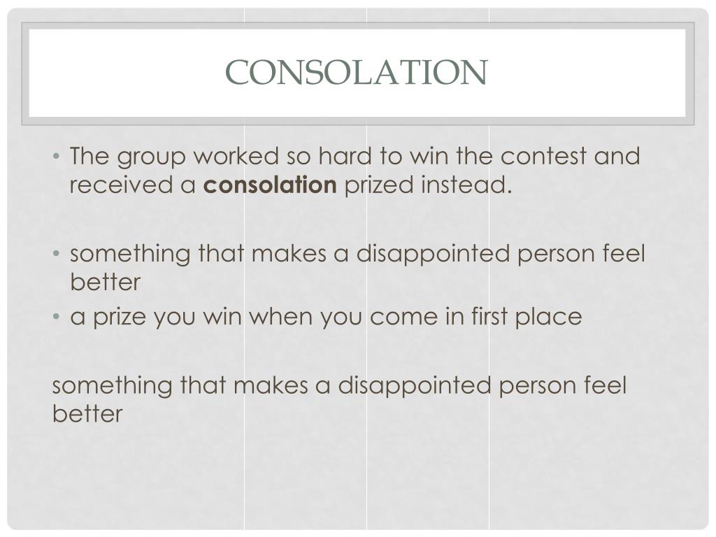 consolation • The group worked so hard to win the contest and received a consolation prized instead. • something that makes a disappointed person feel better • a prize you win when you come in first place something that makes a disappointed person feel better