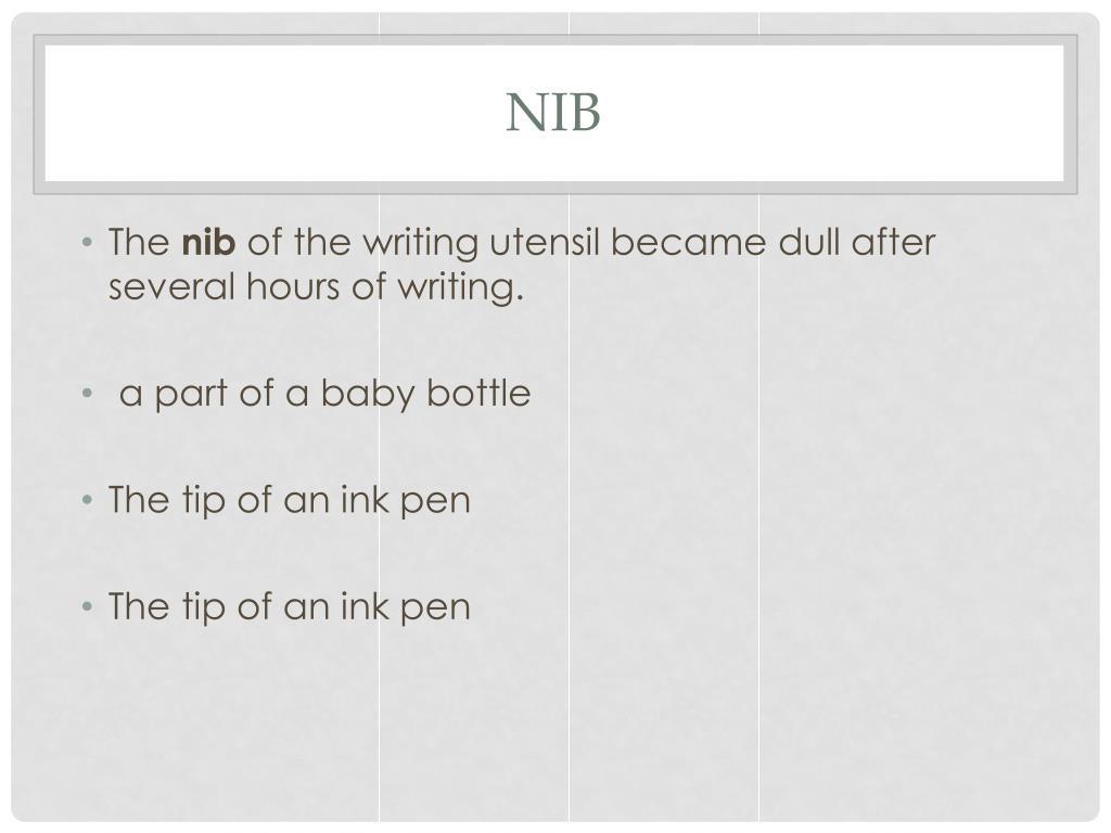 nib • The nib of the writing utensil became dull after several hours of writing. • a part of a baby bottle • The tip of an ink pen • The tip of an ink pen