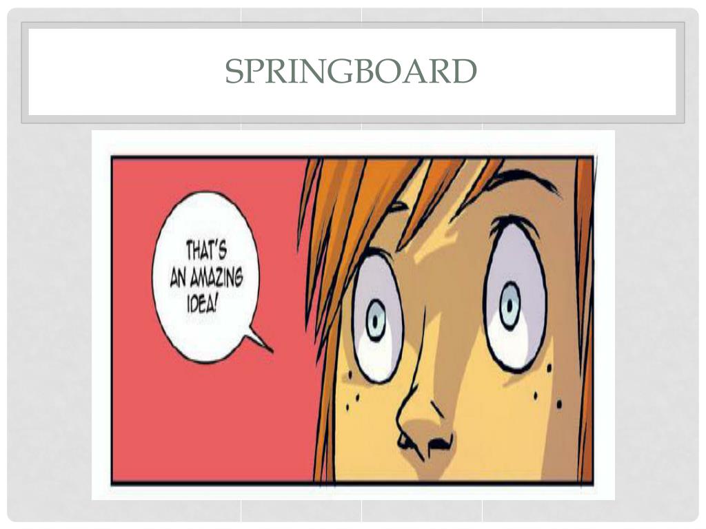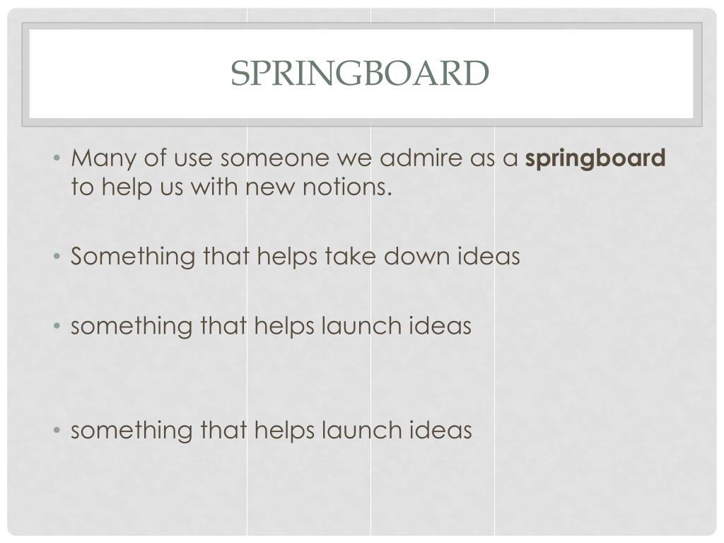 springboard • Many of use someone we admire as a springboard to help us with new notions. • Something that helps take down ideas • something that helps launch ideas • something that helps launch ideas