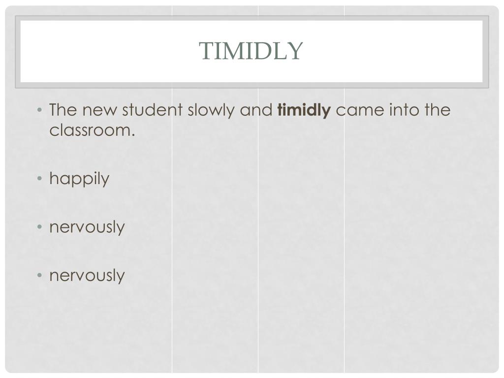 timidly • The new student slowly and timidly came into the classroom. • happily • nervously • nervously