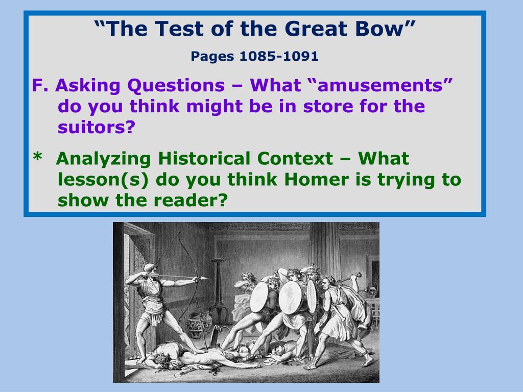 “The Test of the Great Bow” Pages 1085-1091 F. Asking Questions – What “amusements” do you think might be in store for the suitors? * Analyzing Historical Context – What lesson(s) do you think Homer is trying to show the reader?