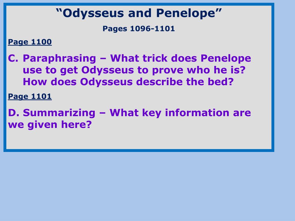 “Odysseus and Penelope” Pages 1096-1101 Page 1100 Paraphrasing – What trick does Penelope use to get Odysseus to prove who he is? How does Odysseus describe the bed? Page 1101 D. Summarizing – What key information are we given here?