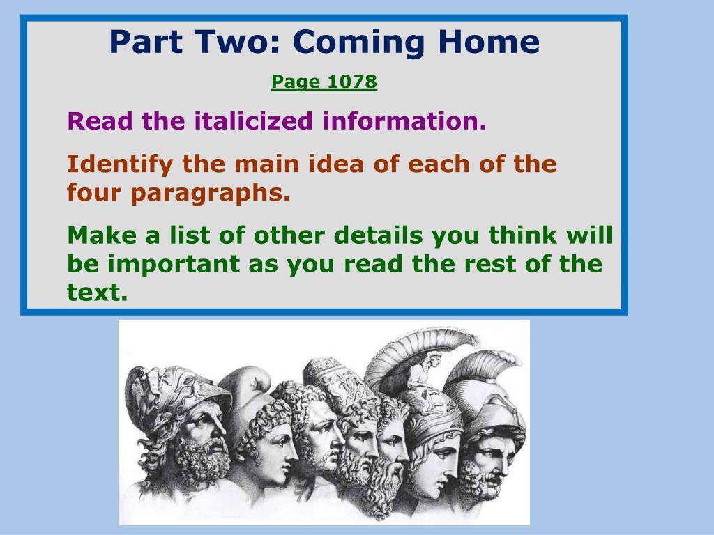 “The Odyssey” by Homer. Reading and Writing Activities. Part Two: Coming Home Page 1078 Read the italicized information. Identify the main idea of each of the four paragraphs. Make a list of other details you think will be important as you read the rest of the text. What’s Happened?