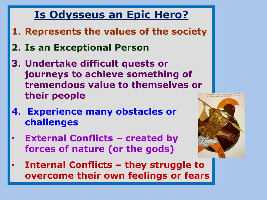 Is Odysseus an Epic Hero? • Represents the values of the society • Is an Exceptional Person • Undertake difficult quests or journeys to achieve something of tremendous value to themselves or their people • 4. Experience many obstacles or challenges • External Conflicts – created by forces of nature (or the gods) • Internal Conflicts – they struggle to overcome their own feelings or fears