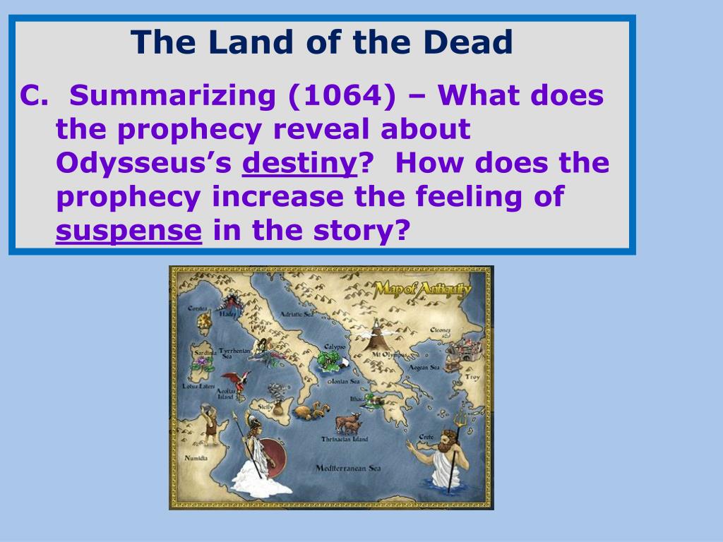 The Land of the Dead C. Summarizing (1064) – What does the prophecy reveal about Odysseus’s destiny? How does the prophecy increase the feeling of suspense in the story?