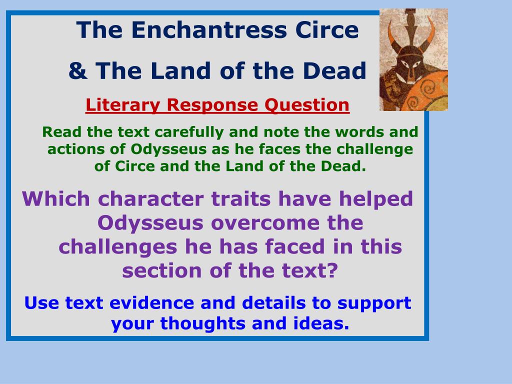 The Enchantress Circe & The Land of the Dead Literary Response Question Read the text carefully and note the words and actions of Odysseus as he faces the challenge of Circe and the Land of the Dead. Which character traits have helped Odysseus overcome the challenges he has faced in this section of the text? Use text evidence and details to support your thoughts and ideas.