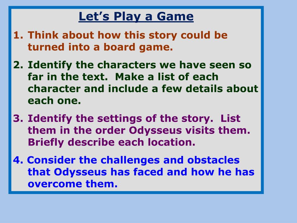 Let’s Play a Game Think about how this story could be turned into a board game. Identify the characters we have seen so far in the text. Make a list of each character and include a few details about each one. Identify the settings of the story. List them in the order Odysseus visits them. Briefly describe each location. 4. Consider the challenges and obstacles that Odysseus has faced and how he has overcome them.