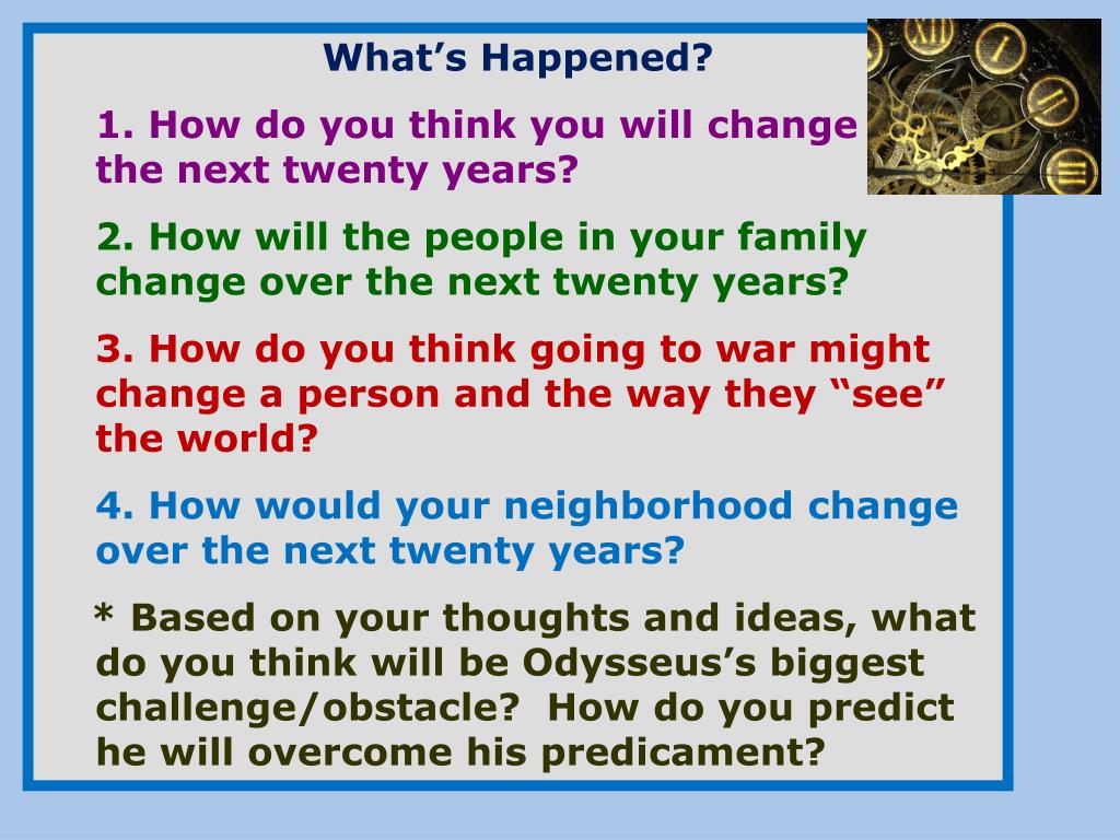 What’s Happened? 1. How do you think you will change over the next twenty years? 2. How will the people in your family change over the next twenty years? 3. How do you think going to war might change a person and the way they “see” the world? 4. How would your neighborhood change over the next twenty years? * Based on your thoughts and ideas, what do you think will be Odysseus’s biggest challenge/obstacle? How do you predict he will overcome his predicament?