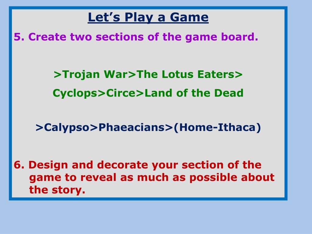 Let’s Play a Game 5. Create two sections of the game board. >Trojan War>The Lotus Eaters> Cyclops>Circe>Land of the Dead >Calypso>Phaeacians>(Home-Ithaca) 6. Design and decorate your section of the game to reveal as much as possible about the story.