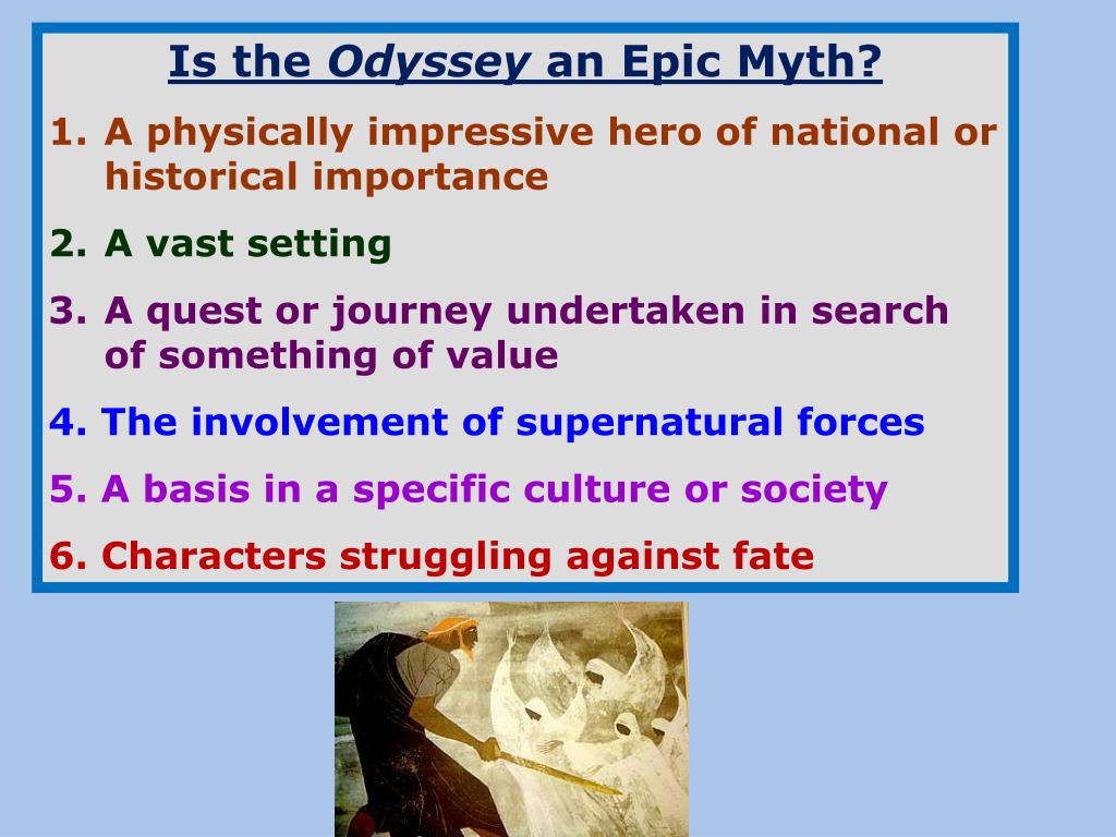 Is the Odyssey an Epic Myth? A physically impressive hero of national or historical importance A vast setting A quest or journey undertaken in search of something of value 4. The involvement of supernatural forces 5. A basis in a specific culture or society 6. Characters struggling against fate