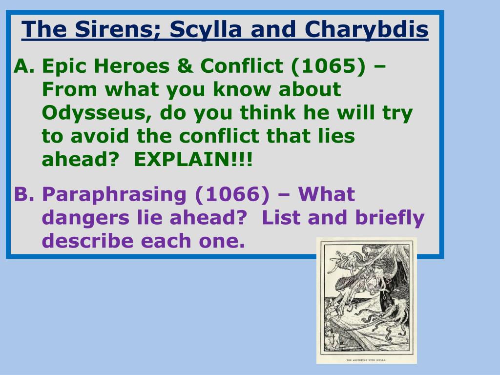 The Sirens; Scylla and Charybdis Epic Heroes & Conflict (1065) – From what you know about Odysseus, do you think he will try to avoid the conflict that lies ahead? EXPLAIN!!! Paraphrasing (1066) – What dangers lie ahead? List and briefly describe each one.