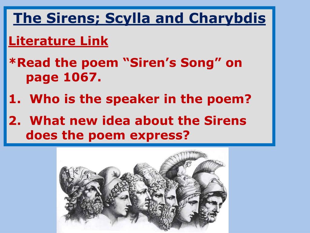 The Sirens; Scylla and Charybdis Literature Link *Read the poem “Siren’s Song” on page 1067. 1. Who is the speaker in the poem? 2. What new idea about the Sirens does the poem express?