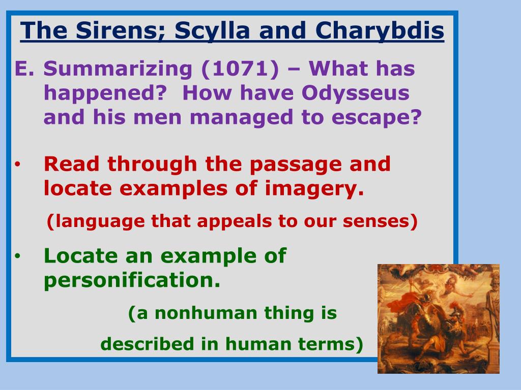 The Sirens; Scylla and Charybdis • Summarizing (1071) – What has happened? How have Odysseus and his men managed to escape? • Read through the passage and locate examples of imagery. • (language that appeals to our senses) • Locate an example of personification. • (a nonhuman thing is • described in human terms)