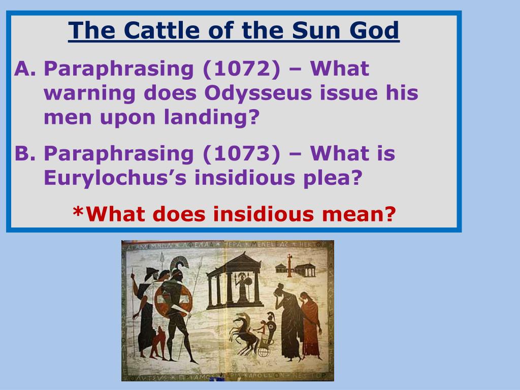 The Cattle of the Sun God • Paraphrasing (1072) – What warning does Odysseus issue his men upon landing? • Paraphrasing (1073) – What is Eurylochus’s insidious plea? • *What does insidious mean?