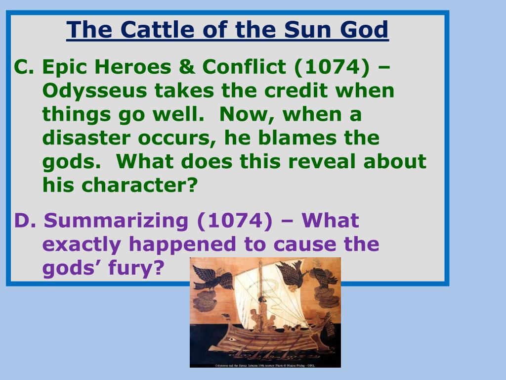 The Cattle of the Sun God C.Epic Heroes & Conflict (1074) – Odysseus takes the credit when things go well. Now, when a disaster occurs, he blames the gods. What does this reveal about his character? D. Summarizing (1074) – What exactly happened to cause the gods’ fury?