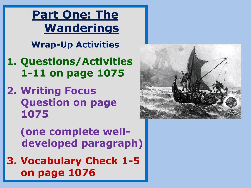 Part One: The Wanderings Wrap-Up Activities 1. Questions/Activities 1-11 on page 1075 2. Writing Focus Question on page 1075 (one complete well-developed paragraph) 3.Vocabulary Check 1-5 on page 1076
