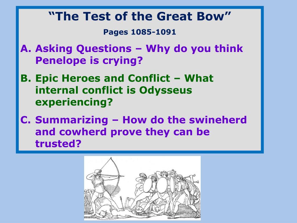“The Test of the Great Bow” Pages 1085-1091 Asking Questions – Why do you think Penelope is crying? Epic Heroes and Conflict – What internal conflict is Odysseus experiencing? Summarizing – How do the swineherd and cowherd prove they can be trusted?
