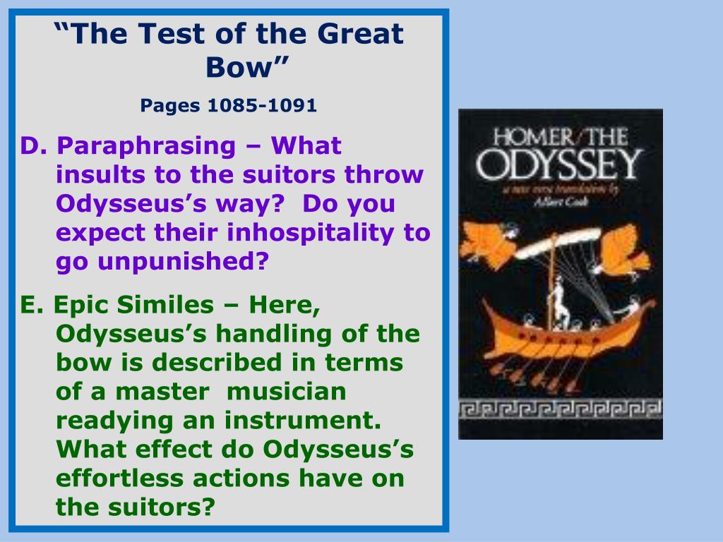 “The Test of the Great Bow” Pages 1085-1091 D. Paraphrasing – What insults to the suitors throw Odysseus’s way? Do you expect their inhospitality to go unpunished? E. Epic Similes – Here, Odysseus’s handling of the bow is described in terms of a master musician readying an instrument. What effect do Odysseus’s effortless actions have on the suitors?