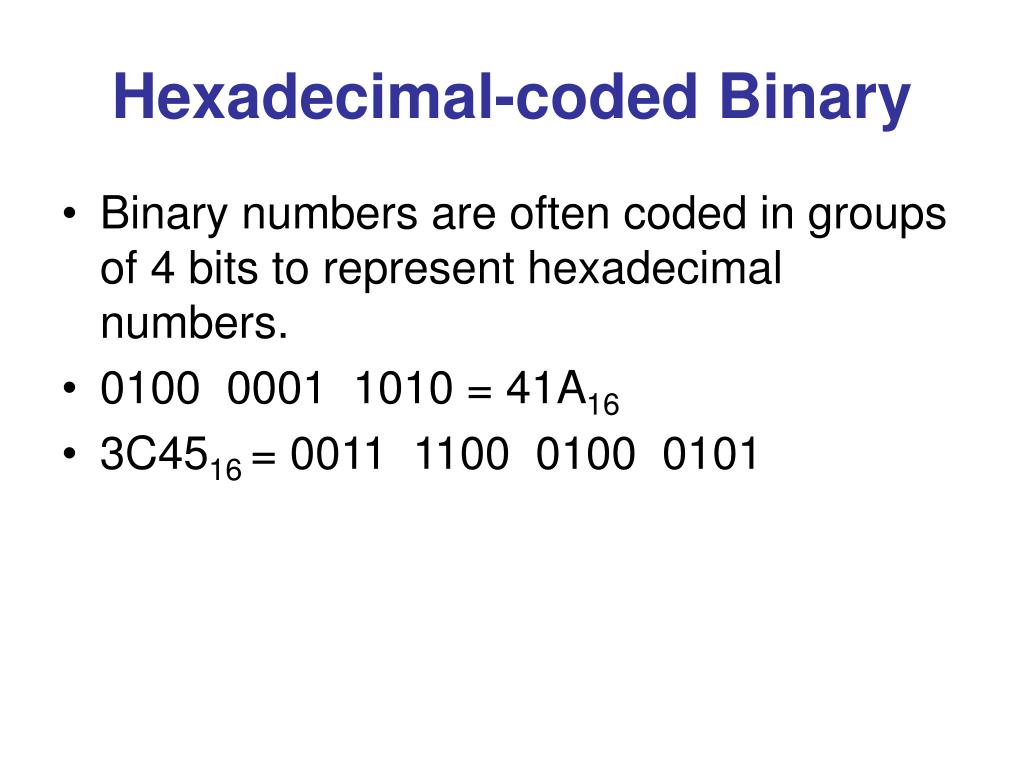 Hexadecimal-coded Binary • Binary numbers are often coded in groups of 4 bits to represent hexadecimal numbers. • 0100 0001 1010 = 41A16 • 3C4516 = 0011 1100 0100 0101