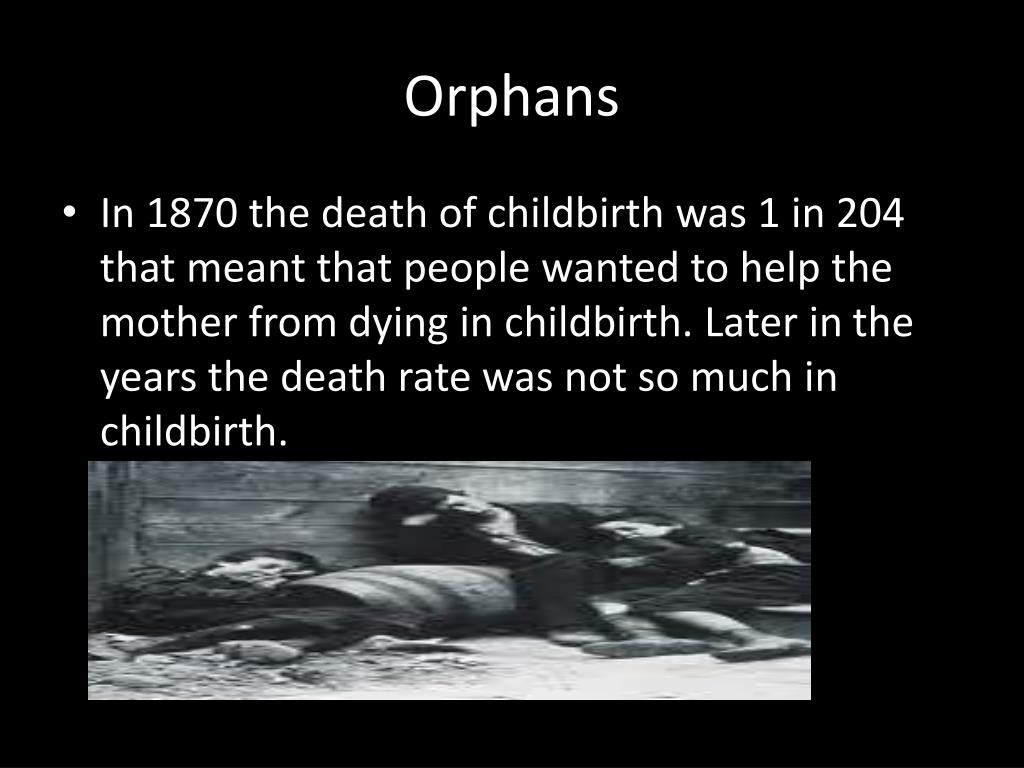 Orphans • In 1870 the death of childbirth was 1 in 204 that meant that people wanted to help the mother from dying in childbirth. Later intheyears the death rate was not so much inchildbirth.