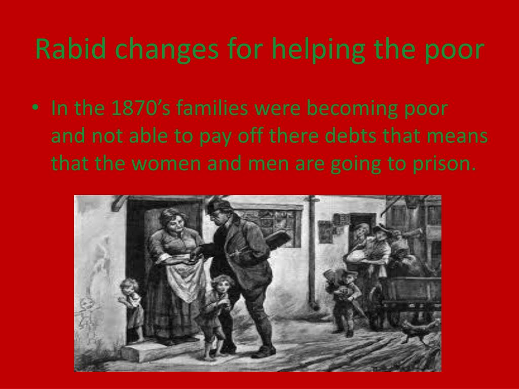 Rabid changes for helping the poor • In the 1870’s families were becoming poor and not able to pay off there debts that means that the women and men are going to prison.