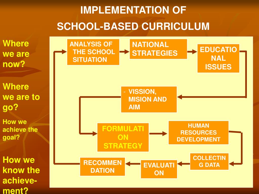 IMPLEMENTATION OF SCHOOL-BASED CURRICULUM Where we are now? ANALYSIS OF THE SCHOOL SITUATION NATIONALSTRATEGIES EDUCATIONAL ISSUES Where we are to go? • VISSION, MISION AND AIM How we achieve the goal? HUMAN RESOURCES DEVELOPMENT FORMULATION STRATEGY How we know the achieve-ment? COLLECTING DATA RECOMMENDATION EVALUATION