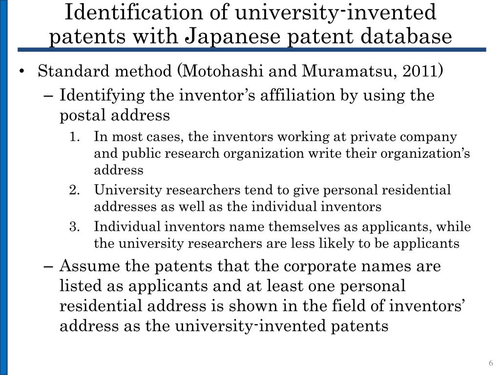 Identification of university-invented patents with Japanese patent database • Standard method (Motohashi and Muramatsu, 2011) • Identifying the inventor’s affiliation by using the postal address • In most cases, the inventors working at private company and public research organization write their organization’s address • University researchers tend to give personal residential addresses as well as the individual inventors • Individual inventors name themselves as applicants, while the university researchers are less likely to be applicants • Assume the patents that the corporate names are listed as applicants and at least one personal residential address is shown in the field of inventors’ address as the university-invented patents