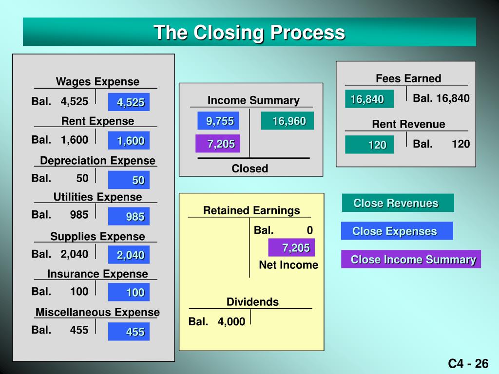 Fees Earned Wages Expense Bal. 16,840 Bal. 4,525 Rent Expense Bal. 1,600 Depreciation Expense Bal. 50 Utilities Expense Bal. 985 Supplies Expense Bal. 2,040 Insurance Expense Bal. 100 Miscellaneous Expense Bal. 455 The Closing Process 16,840 Income Summary 16,960 Rent Revenue Total Revenues Bal. 120 120 Close Revenues Retained Earnings Bal. 0 Dividends Bal. 4,000