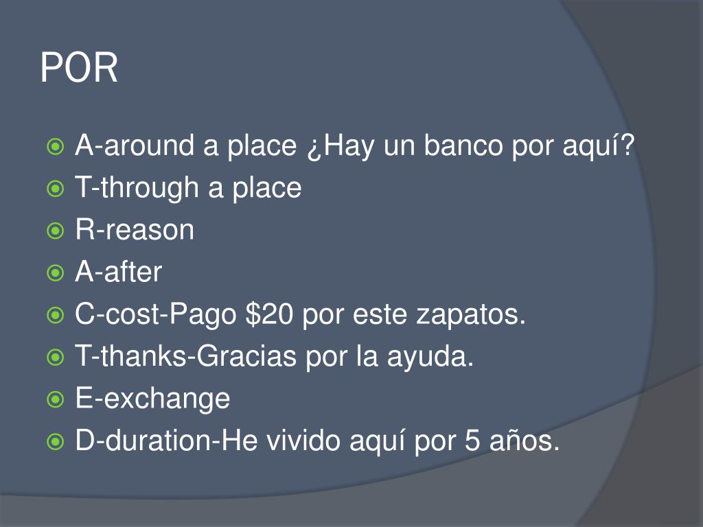 POR • A-around a place ¿Hay un bancoporaquí? • T-through a place • R-reason • A-after • C-cost-Pago $20 porestezapatos. • T-thanks-Gracias por la ayuda. • E-exchange • D-duration-He vividoaquípor 5 años.