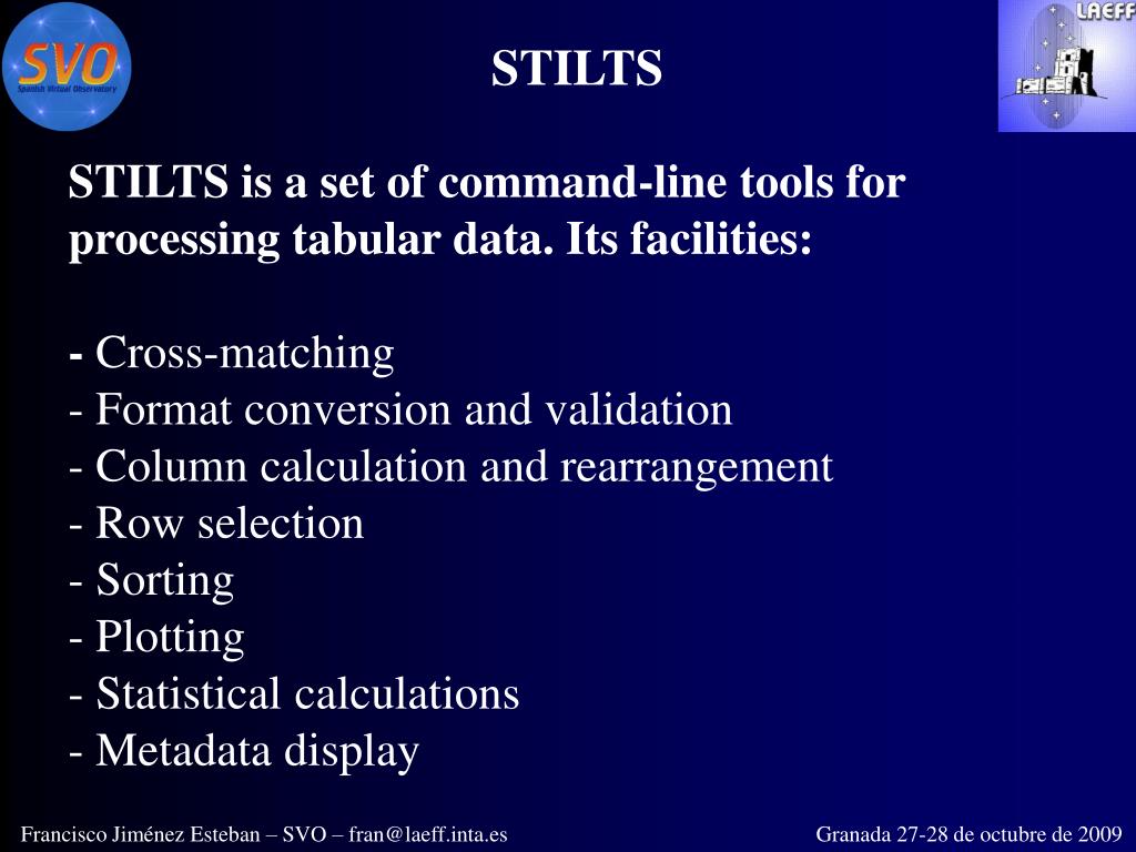 STILTS STILTS is a set of command-line tools for processing tabular data. Its facilities:- Cross-matching- Format conversion and validation- Column calculation and rearrangement- Row selection- Sorting- Plotting- Statistical calculations- Metadata display Francisco Jiménez Esteban – SVO – fran@laeff.inta.es Granada 27-28 de octubre de 2009