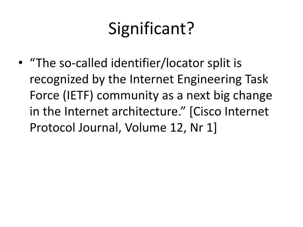 Significant? • “The so-called identifier/locator split is recognized by the Internet Engineering Task Force (IETF) community as a next big change in the Internet architecture.” [Cisco Internet Protocol Journal, Volume 12, Nr 1]